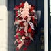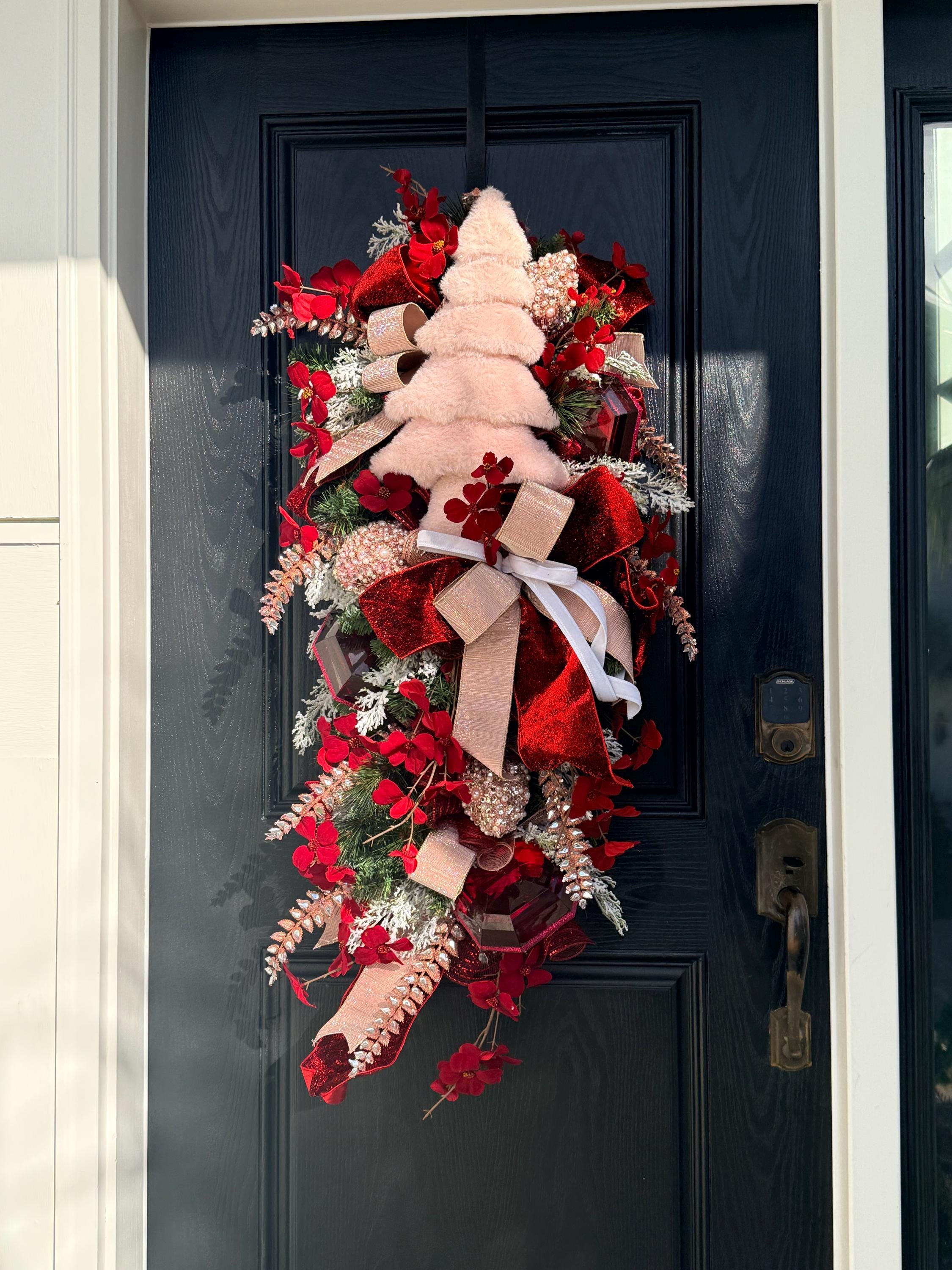 Add a touch of elegance to your holiday decor with this stunning handmade Christmas swag wreath. Featuring soft pink and bold red velvet ribbons, fluffy pink trees, and vibrant faux florals, this unique wreath is designed to bring festive charm to your front door or wall. Accented with snowy greenery and glittering details, it’s a sophisticated piece perfect for creating a warm, inviting atmosphere in your home this holiday season.